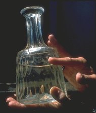 Jennifer holding a Baccarat crystal decanter. Her index finger is pointing to the White Star Line logo.