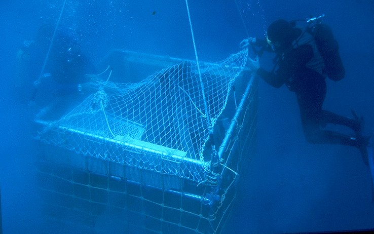 Divers placing netting over the top of an underwater retrieval basket to prevent items from falling out when brought to the surface.